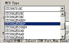 启动本烧录程序后,第一步就是选择烧录器件。本烧录软件支持STC全系列的51单片机芯片,因此,第一步必须选择相对应的型号。由于本实验板选用的单片机芯片就是本烧录软件首次启动默认的型号,所以,本项一般都不需要选择。