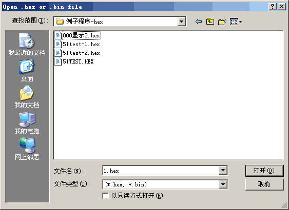 本光盘中提供了一些例子程序,大家可以点“open file”按钮,弹出以下窗口(源程序也有,但这里不显示),先选择一些例子程序烧录实验。