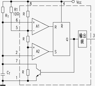 555时基电路常用于制作定时器,电路如图所示。虚线框内部分是555时基电路内部功能原理图。当②脚电位低于1/3Vcc时,③脚输出高电平,当⑥脚电位高于2/3Vcc时,③脚输出低电平。作定时器用时,通常是利用电容CT从0充电到2/3Vcc这段时间,或从2/3Vcc放电到1/3Vcc这段时间作定时时间。要使定时时间延长,必须增大RTCT的值,RTCT的值过大,定时时间不够精确。 1、 本站不保证以上观点正确,就算是本站原创作品,本站也不保证内容正确。 2、如果您拥有本文版权,并且不想在本站转载,请书面通知本站立即删除并且向您公开道歉! |
