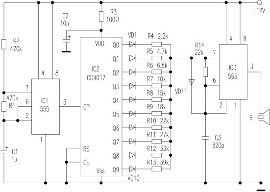 多频超声波发生器电路见图,IC1(NE555)构成时钟振荡器,产生频率为1Hz的时钟信号,此信号作用于IC2(CD4017)的时钟输入CP端,使IC2的输出端Q0~Q9依次输出高电平,各输出端高电平持续期均为1s。IC3(NE555)构成超声波振荡器,由于IC2的Q0~Q9输出端的电阻R4~R13的阻值各不相同,它们分别与C3组成的充电时间常数不同,因此在Q0~Q9依次为高电平的各个时段内,IC3输出的振荡频率不同。当Q0为高电平时,IC3输出约23kHz的信号;当Q9为高电平时,IC3输出约64kHz的信号。十种频率的信号持续期各为1s,周而复始地产生,因而压电扬声器B周而复始地发出10种不同频率的超声波。