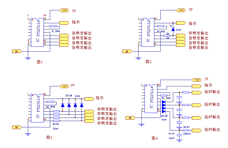 | 选择分类:当前分类——电子制作 相关联或者相类似的文章: 怎样安装AT51编程板的USB转串口软件?(8206) 装在火柴盒里的悄悄听别人讲话的发射器(1999) 红外感应电子狗制作详解(1560) 台灯触摸开关(1560) ++ 带限流保护的可调稳压电源 (1331) 分立电子开关、OTL功放详解(1274) 用单片机控制字符型液晶显示模块(1249) 厨房定时器(1160) 电子制作专用微型模块盒子(1132) 性能可靠的60W石英灯用电子变压器(1091) 做梦机的制作(1078) 自己动手制作无线话筒(944) MA21小型电子调速器的制作(939) 500米无外壳四通道遥控模块(926) 关于“D40”最早的文章(907) 用三端稳压LM317制作的甲类功放(898) ++ 汽车电池电压监视器 ++(897) 电子小鸡(896) 简单实用的遥控开关(895) 简易电话机测试装置(889) 首页 前页 后页 尾页 本站推荐: | 译码集成块PT2272的应用 PT2272被广泛应用在报警电路中做译码器,与PT2262配套使用,它具有电路简洁,耗电低,码种多,容易装配等优点。PT2272通常有L4、L6和M4两种后缀输出形式。L4、L6是四路和六路自锁定输出, M4则是四路非锁定输出。在PT2272-L4或-L6的具体应用中,见图1,有时我们不需要全部的自锁定输出,而要将其中某一路或几路自锁定输出端设为非锁输出,只要将图1改为图2的接法即可。 ![]() 电路只多用了一只二极管和一只电阻,就将PT2272-L4的第 13 脚的自锁定输出改接为非锁定输出。由于接收指示端第 17 脚只有接收解码正确才输出为高电平,发射机不工作时它转为低电平。编码信号发射时, 13 脚锁定输出高电平, 17 脚同时为高电平,D截止, 13 脚的输出接口为高电平输出;当编码发射器停止发射时,译码器没有接收到正确信号,虽然 13 脚已锁定成了高电平,但 17 脚已转为低电平,使二极管D正偏导通,将 13 脚经R2输出的高电平下拉为0.7V以下,D用锗二极管2AP9则输出电平更低。所以输出接口在未解码时就为低电平输出了,即为非锁状态,其它几路仍为自锁定状态。 图3则是将自锁型PT2272-L4或-L6的各输出脚全转为非锁定输出,原理与图2相同。这里R2-R5取2k是考虑各脚同时输出高电平时将电平下拉效果降低的情况。此电路结构缺点是输出高电平时耗电加大,有数毫安。在本集成块输出端后级为高输入阻抗的电路中,将R2-R5尽量取大,可以是100K-1M,当然要保证后级能正常工作。如果后级是接8421显示译码器,则此电阻可以是数百K。 在一些非锁定控制电路中,遥控时经常会出现后级被控继电器或其它执行器件不稳定现象,原因有二,其一是接收器译码成功后电路启动时出现的一些电磁干扰和电压起伏使译码器瞬间复位;第二是发射信号不够强或无线距离过远,集成块收到的编码信号断断续续,中途有断开时间,造成执行错误。这时可按图4接入阻容二极管来做延时处理。每次收到编码信号时,非锁定的各路相应输出脚经二极管对电容充电,再经电阻控制后级电路工作。在输出脚短时失电时,电容上的电量还能延时维持供电。延时长短由电容和电阻的大小来决定。电路中的干扰大多是极为短暂的,编码的断续也是指丢失几个编码串。因此,C选1微法绦纶电容,R选用100K普通电阻,用在后级接三极管推动继电器的电路中延时约0.1秒多,这个延时时间已足够消除干扰带来的影响,对电路性能也几乎没有什么负面影响。如果是接在非三极管驱动的其它电路中,在调试中粗略确定延时时间。但延时时间除特别需要外不应大于0.5秒,否则控制电路没有时效,会带来控制的滞后,使整个控制电路失去意义。(例:延时0.1秒时,在编码信号停止发送后,要隔0.1秒继电器才释放。这么短的延时,除非是在百米跑中,用在非锁定的控制电路中都很难感觉出来。) 1、 本站不保证以上观点正确,就算是本站原创作品,本站也不保证内容正确。 2、如果您拥有本文版权,并且不想在本站转载,请书面通知本站立即删除并且向您公开道歉! |