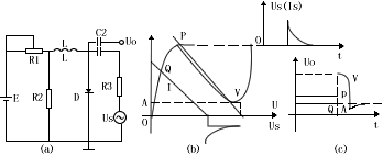 图2(a)是单稳态是路,若调节电位器R1,使由R1//R2及R2E/(R1+R2)作出的负载线I处于低压正阻区内,其静态工作点Q是稳定点(图2(b),这时若无触发脉冲作用,电路处于稳定状态。但在触发脉冲us作用下,负载线从I移至II,由于隧道不能停留在负阻区,及电感不允许电流突变,所以当电流I增至峰点电流时,就发生如下的恒流跃变: