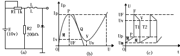 图三(a)为自激多谐振荡电路。静态工作点Q置于负阻区(见图3(b))。当接通电源后,电流I从零开始增至峰点电流,Ipo但由于静态点不稳点,加上电感不允许电流突变,所以电流增至Ip后,周而复始地进行,从而产生了快速的矩形脉冲[见图3(C)]。其参数如下: