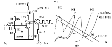 从图5(b)可见,反向二极管与隧道二极管串接后,其组合特性:在电压较低时由反向二极管决定:在电压较高时,与硅晶体管的正向特性类似,两者之间又存在负阻区,若按图5(b)设置静态点Q1,当A为低平电平时,B为高电平(0.8伏),BG3导通,集电极电压Uc3=3伏。BG4的射极输出端Uo为零伏低电平,当A点为负电平Um时,负载线向左转移,很快地进入另一稳定点Q3。UQ3低于BG3的载止电压,故BG3载止,输出,输出Uo为高电平,约18伏左右。一旦当A点回到零平时,负载线回到右边,工作点从Q3→P→F→Q1点,输出Uo又迅速回到零电平,由于隧道二极管的变化速度特别快,所以输出脉冲的前后沿很陡。晶体管示波器常用隧道二极管]作整形电路。
