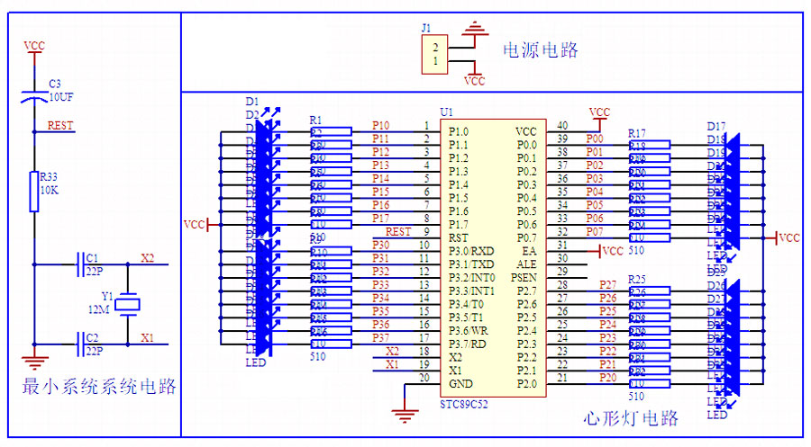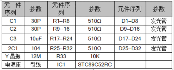 | 选择分类:当前分类——电子制作 相关联或者相类似的文章: 怎样安装AT51编程板的USB转串口软件?(8206) 装在火柴盒里的悄悄听别人讲话的发射器(1999) 红外感应电子狗制作详解(1560) 台灯触摸开关(1560) ++ 带限流保护的可调稳压电源 (1331) 分立电子开关、OTL功放详解(1274) 用单片机控制字符型液晶显示模块(1249) 厨房定时器(1160) 电子制作专用微型模块盒子(1132) 性能可靠的60W石英灯用电子变压器(1091) 做梦机的制作(1078) 自己动手制作无线话筒(944) MA21小型电子调速器的制作(939) 500米无外壳四通道遥控模块(926) 关于“D40”最早的文章(907) 用三端稳压LM317制作的甲类功放(898) ++ 汽车电池电压监视器 ++(897) 电子小鸡(896) 简单实用的遥控开关(895) 简易电话机测试装置(889) 首页 前页 后页 尾页 本站推荐: | 单片机七彩心形流水灯套件 单片机流水灯实际上就是一个单片机最小应用系统,即为由发光二极管、晶振、复位、电源等电路和必要的软件组成的。总共有32个LED灯,4个I/O全部用上了。用510欧电阻串联LED,限流保护LED灯不被烧坏。晶振可以用12M的或11.0592M也行,C1,C2用22PF(或30P)。