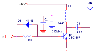 | 选择分类:当前分类——电子制作 相关联或者相类似的文章: 105W卤素灯用可调光电子变压器(426) 检查晶闸管的触发能力四种方法(425) PM50系列智能语音芯片(423) 步进电机工作原理(423) 硬件设计鸡毛蒜皮之一: 低功耗设计(423) 26. 点阵式LED简单图形显示技术(423) ss570122的雕刻机制作过程(7)(422) 人最长寿命能活多少年? (422) 译码集成块PT2272的应用(421) 我不是处女(420) ++ 相片暴光定时器&(415) 魔之妩媚(415) TDA2004的详细资料:10W+10W立体声功率放大器(415) 双路计数器加比较程序(413) 电子基础知识--半导体(412) 两千零一年的回忆 文 / 羡鸟飞 (412) 单片机开发调试应注意的问题(410) 电工学名词解释(408) 简易压电陶瓷蜂鸣器(408) 7. I/O并行口直接驱动LED显示(407) 首页 前页 后页 尾页 本站推荐: | 315M遥控电路设计 OOK调制尽管性能较差,然而其电路简单容易实现,工作稳定,因此得到了广泛的应用,在汽车、摩托车报警器,仓库大门,以及家庭保安系统中,几乎无一例外地使用了这样的电路。 早期的发射机较多使用LC振荡器,频率漂移较为严重。声表器件的出现解决了这一问题,其频率稳定性与晶振大体相同,而其基频可达几百兆甚至上千兆赫兹。无需倍频,与晶振相比电路极其简单。以下两个电路为常见的发射机电路,由于使用了声表器件,电路工作非常稳定,即使手抓天线、声表或电路其他部位,发射频率均不会漂移。和图一相比,图二的发射功率更大一些。可达200米以上。