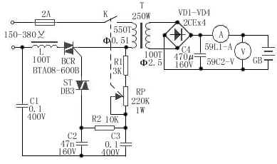 工作原理:如上图所示,接通电源后,交流电通过变压器的初级绕组、R1、RP及R2向电容C2充电,当C2上的电压达到触发双向二极管ST导通电压时,C2通过ST及双向可控硅BCR放电,并触发BCR导通,使变压器T初级有电流流过,在交流电过零时,BCR关断,C2又开始充电,重复上述过程。调节电位器RP时,改变了C2充电时间常数,即改变了双向可控硅的导通角,起到电子调节电压的作用,同时变压器T的次级电压也相应变化,改变了充电电压和充电电流。