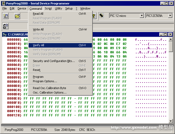 为了确认程序写入正确,最好校验一下,点击“Command”菜单中的“Verify All”,进行校验