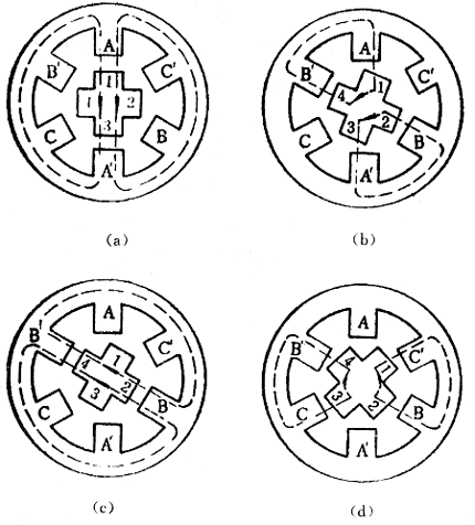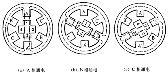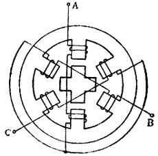 图1是反应式步进电动机结构示意图,它的定子具有均匀分布的六个磁极,磁极上绕有绕组。两个相对的磁极组成一组,联法如图所示。 下面介绍反应式步进电动机单三拍、六拍及双三拍通电方式的基本原理。 一、单三拍通电方式的基本原理