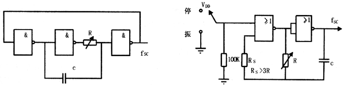 脉冲发生器是一个脉冲频率由几赫到几十千赫可连续变化的脉冲信号发生器。脉冲发生器可以采用多种线路,最常见的有多谐振荡器和单结晶体管构成的张弛振荡器两种,它们都是通过调节电阻R和电容C的大小来改变电容器充放电的时间常数,以达到改变脉冲信号频率的目的。图6是两种实用的多谐振荡电路,它们分别由反相器和非门构成,振荡频率由RC决定,改变R值即可改变脉冲频率。