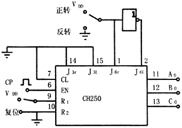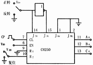 J3r、J3L两端子是三相双三拍的控制端,J6r、J6L是三相六拍的控制端,三相双三拍工作时,若J3r=“1”,而J3L=“0”,则电机正转;若J3r=“0”,J3L=“1”,则电机反转;三相六拍供电时,若J6r=“1”,J6L=“0”,则电机正转;若J6r=“0”,J6L=“1”,电机反转。R2是双三拍的复位端,R1是六拍的复位端,使用时,首先将其对应复位端接入高电平,使其进入工作状态,然后换接到工作位置。CL端是时钟脉冲输入端,EN是时钟脉冲允许端,用以控制时钟脉冲的允许与否。当脉冲CP由CL端输入,只有EN端为高电平时,时钟脉冲的上升沿才起作用。CH250也允许以EN端作脉冲CP的输入端,此时,只有CL为低电平时,时钟脉冲的下降沿才起作用。A0、B0、C0为环形分配器的三个输出端,经过脉冲放大器(功率放大器)后分别接到步进电动机的三相线上。 CH250环形脉冲分配器的功能关系如表1所列。
