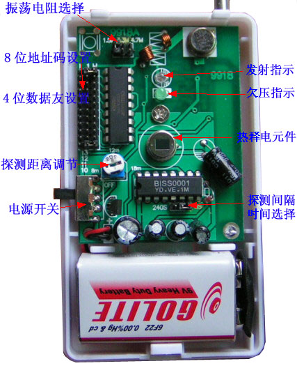 无线人体热释电传感器的发射机地址码必需和接收机的地址码完全一致,打开无线电传感器的外壳.