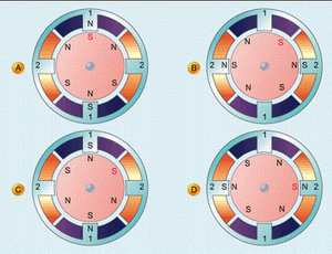 现在假设我们构造一个定子上缠绕有两个绕组的电机,内置一个能够绕中心任意转动的永久磁铁,这个可旋转部分叫做转子。图2给出了一种简单的电机,叫做双相双极电机,因为其定子上有两个绕组,而且其转子有两个磁极。如果我们按图2a所示方向给绕组1输送电流,而绕组2中没有电流流过,那么电机转子的南极就会自然地按图中所示,指向定子磁场的北极。