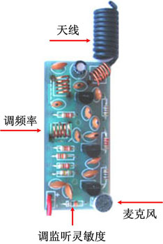 4.如果发射频率与本地广播频率重叠或相近,则需要微调发射频率: ![]() 如何避开普通FM广播频段:如果不想让普通收音机收到信号,可以调校频率避开普通FM广播频段(88Mhz~108Mhz),然后使用特殊收音机接收,这里推荐德生的R-202T 袖珍式调频/调幅电视伴音收音机,它的调频(FM)接收频率范围是 64 - 108兆赫(MHz),可以将发射模块的频率调在88兆赫(MHz)以下。 器件提供:http://www.eelike.com/cp/TEL.htm 套件提供:http://www.eelike.com/cp/fm2.htm 微型贴片调频发射片的监听灵敏度高于人耳,在安静地环境下可以听到1米以外石英钟走动“滴嗒”声。微型贴片调频发射片的监听灵敏度决定于话筒的偏置电阻,如果你需要监听灵敏度低一点,如:老师用无线话筒,可以将模块的话筒偏置电阻R1增大至56K,偏置电阻的阻值可以在3.3K~200K之间选择,阻值越小,话筒的灵敏度越高。微型贴片调频发射片体积只有1.2X4X0.6毫米,大小和小手指差不多,工作电压为3~9伏,对应的工作电流4~50毫安,发射距离:9伏时开阔地大于200米,工作频率预调在88.8MHZ,通过调整电感线圈可以使发射频率在70~110MHZ之间,线圈拉升时发射频率上升,压缩时发射频率下降。 当希望微型贴片调频发射片发射距离最远时需要注意:微型贴片调频发射片最好离地面5米以上,可以明显增加发射距离。如果天线采用用有线电视馈线制作的半波同轴天线并架设在室外高处可以显著增大发射距离。 注意事项: 调频接收机的接收灵敏度很大程度上影响微型贴片调频发射片的传输距离,市场上一般的电调谐收音机接收微型贴片调频发射片效果不是很好,主要是自动锁台锁不住,所以建议使用手动调谐的。一般普通的调频接收机灵敏度不是很高,一般能在空旷地100米内能接收,经过测试,发现用高性能的德劲DE1102或者德生PL-200调频接收机效果非常不错,能在400米以内接收到,采用高性能的汽车调频收音机,曾经在500米接收到微型贴片调频发射片的信号。微型贴片调频发射片用9V叠层电池可连续工作10小时以上。接收机最好采用手调谐的调频收音机,可以补偿轻微的频飘。近距离使用时必须用耳机监听,否则由于声音反馈,容易形成自激啸叫。 主要应用: 1、婴儿守护:模块放置在婴儿睡觉或者玩耍的房间,大人可在其它房间或厨房监听其动态。 2、防盗监听:模块放置在走廊、庭院、过道或者仓库,可在寝室、保安房监听其动态。 3、耳聋助听器:模块配备便携式FM收音机即可用于耳聋助听器,有很高的助听灵敏度。 4、服务对讲:模块配备便携式FM收音机即可用于商场、超市、酒店服务员之间无线对讲。 5、无线话筒:用于教师讲课、演讲、会议以及电声乐器的拾音等用途。 6、设备监控:放置在动力机房中监听电机轴承噪声和震动,用带有信号电平指示的接收机可实现 联动监控,连接继电器控制接触器的电路,当电平大于危险指标时联动电路动作。 7、监听前端:模块作为前端拾取微弱声音信号,发送的信号经附近的大功率无线发射机转发后实现远程无线监听系统。 套件提供:http://www.eelike.com/cp/fm2.htm![]() 如何避开普通FM广播频段:如果不想让普通收音机收到信号,可以调校频率避开普通FM广播频段(88Mhz~108Mhz),然后使用特殊收音机接收,这里推荐德生的R-202T 袖珍式调频/调幅电视伴音收音机,