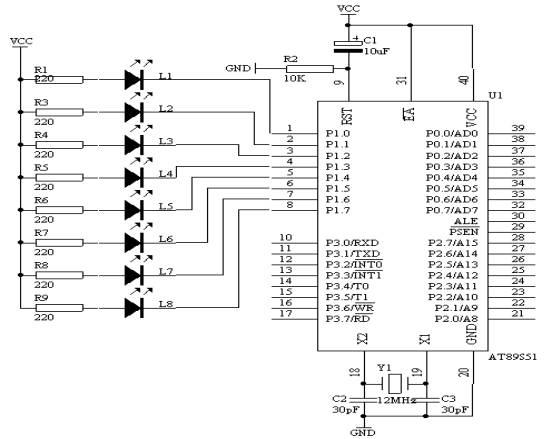 做单一灯的左移右移,硬件电路如图4.4.1所示,八个发光二极管L1-L8分别接在单片机的P1.0-P1.7接口上,输出“0”时,发光二极管亮,开始时P1.0→P1.1→P1.2→P1.3→┅→P1.7→P1.6→┅→P1.0亮,重复循环。