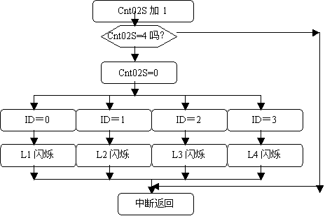 (3.       由于每次2秒定时到时,L1-L4要交替闪烁。采用ID来号来识别。当ID=0时,L1在闪烁,当ID=1时,L2在闪烁;当ID=2时,L3在闪烁;当ID=3时,L4在闪烁