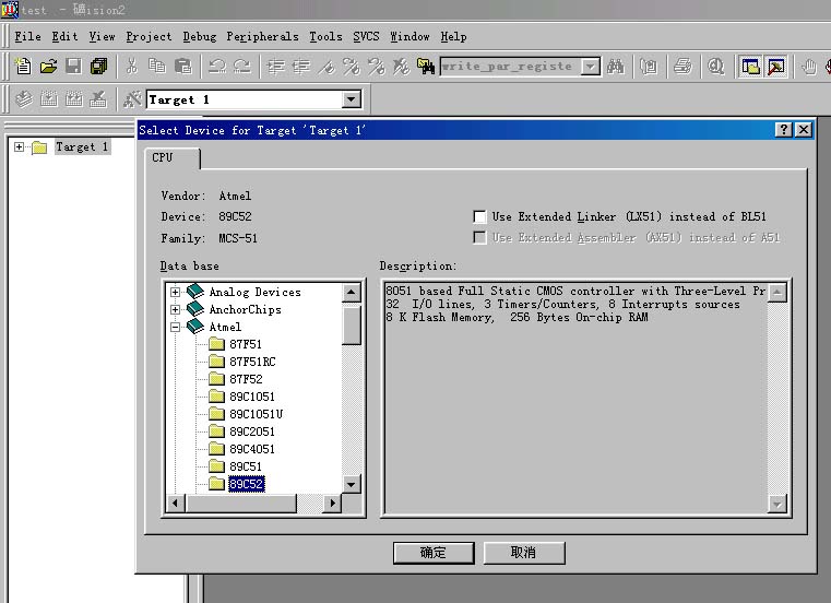 3)这时会弹出一个对话框,要求你选择单片机的型号,你可以根据你使用的单片机来选择,keil c51几乎支持所有的51核的单片机,如果你设计的是华邦的W77E58,可以选择winbond->W77E58,但是有一些版本,比如6.02,对它不能仿真,但是可以选择dallas的ds80c320来代替设计W77E58,两者的内核是一样的,只是w77e58带flash rom,而ds80c320没有flash rom,如果你的软件在仿真W77e58的时候有问题,那么就选用ds80c320 .我这里还是以大家用的比较多的Atmel 的89c52来说明,如图所示,选择89c52之后,右边一栏是对这个单片机的基本的说明,然后点击确定.