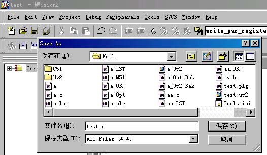 6)选择你要保存的路径,在文件名里输入文件名,注意一定要输入扩展名,如果是c程序文件,扩展名为.c,如果是汇编文件,扩展名为.a51,如果是ini文件,扩展名为.ini,其他文件类型,比如注解说明文件,可以保存为.txt的扩展名.那么我们这里是要存储一个c源程序文件,所以输入.c扩展名,保存为test.c的名字,(也可以保存为其他名字,比如learn.c等),点击保存.
