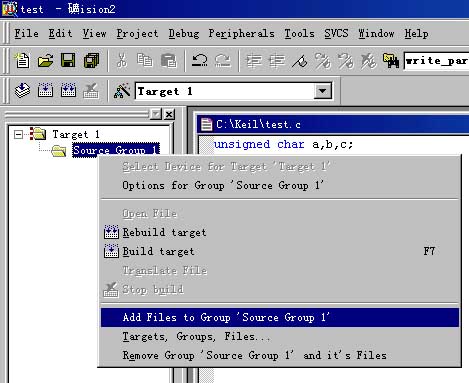 8)用右键点击Sourece Group 1(注意用鼠标的右键,而不是左键),将弹出一个菜单,选择Add Files to Guoup"Source Group 1".