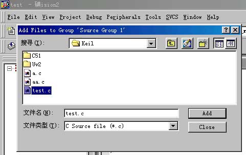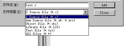 文件类型选择C Source file(*.c).因为我们的是c程序文件,所以选择该类型,如果是汇编文件,就选择asm source file.如果是目标文件,选择Object file,如果是库文件,选择Library file.最后点击Add.点击add之后,窗口不会消失,(如果要添加多个文件,可以不断添加),添加完毕此时再点击Close关闭该窗口.
