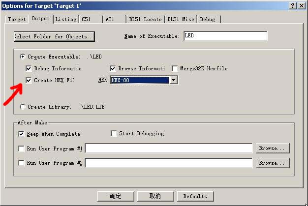 11)用鼠标右键(注意用右键)点击左边的Target 1,会出现一个菜单,选择Options for Target "Target 1",会出现一个选项,如下图,选中“Create Hex File",红色箭头所示!