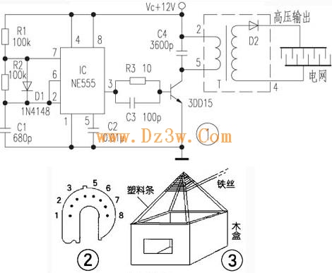 | 选择分类:当前分类——实用电路 相关联或者相类似的文章: 测电流法(505) 器件的筛选与检测(505) 飞行写真(505) 几款直流升压电路(504) 重复式定时电路(503) 28. 数字电压表(503) 防抖动轻触开关(503) 外星人来的那一天(503) 常用运算放大器(502) 315MHz无线红外探测器(502) 怎样利用音乐改善心理状态?(502) 巧购电子元器件(502) 单片机可编程广播自动播出系统(502) 小小电容之大大观(502) 购物21个月后以诚信为理由要求退款(500) 电子高压灭蝇器电路图解(500) 电子点火器电路图及工作原理分析(500) 蓝牙收发芯片RF2968的原理及应用 (500) 如何DIY 投影机?新手知识讲座!(500) 学电子----电子元件介绍(500) 首页 前页 后页 尾页 本站推荐: | 电子高压灭蝇器电路图解 工作原理:NE555组成脉冲振荡电路,输出高频率的脉冲信号,驱动一个NPN大功率管3DD15导通和截止,这样,在变压器T的次级便感应出高压脉冲,通过整流可得到近万伏的直流高压。 1、 本站不保证以上观点正确,就算是本站原创作品,本站也不保证内容正确。 2、如果您拥有本文版权,并且不想在本站转载,请书面通知本站立即删除并且向您公开道歉! |
