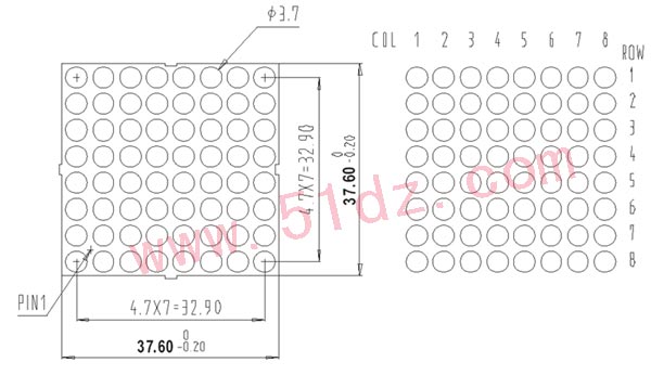 1588高亮红色共阳点阵,发光尺寸:Φ3.75mm,列行:8×8,发光颜色:高亮红色,极性:共阳,散射剂:透明,表面黑色。总点数:64,表面大小 :38×38×10.3(mm),双列12脚,位距:2.54×11=27.94mm  本站的4字套件就是用的本点阵,欢迎大家选用。