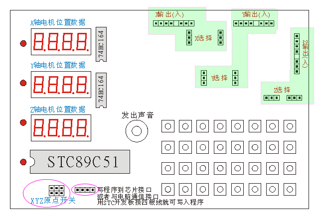接步进电机时,每组输出只需要用到左边的四根针,右边的请空起来,请参考原理图接线。为了最终能做成实用的产品,本板在这么少元件的情况下,还特地在左下有三个原点开关检测位。工作原理是这样的,每次开机时,机器各路电机自动向原点方向移动,当移动到原点位置时,原点外安装了行程开关或者光电开关接通,电机停电,LED上显示0,机器处理预备状态,这样方便产品生产。