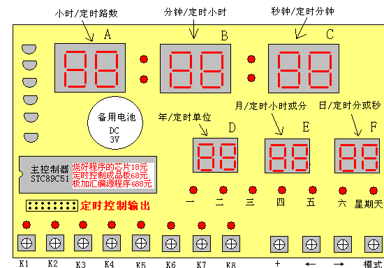 例如:学校工厂的定时打铃、定时开关路灯、定时开关喷泉、定时开关风扇,可以同时控制多种设备,采用STC89C51芯片可以设定42组启动关闭数据,采用STC89C54可以设定84组。本商品停电后正常走时,设定的定时数据保存10年以上,不受停电影响(无备用电池时也可保存10年)。本站主要提供为大家学习的散件为主,不提供成品。本站是经过反复实验过的,确保安装无误一次性成功。