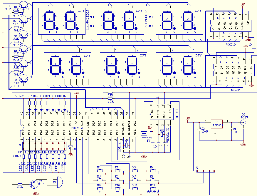 | 功能: 显示年、月、日、时、分、秒、星期、定闹等。本程序还可以实现以下功能:可以设定多组多路设备,在星期x的xx:xx打开,经过xx:xx后自动关闭,同时任意手动打开关闭。例如:控制学校星期X的XX:XX打铃X秒后关闭;控制路灯星期X的XX:XX点亮X小时XX分后关闭;控制电子厂焊接锡炉星期X的XX:XX分自动打开预热并12小时后自动关闭;控制家中电灯电器定时自动打开和关闭摸拟家中有人;控制电饭煲或者其它器自动打开和关闭等等。当然,用户用来控制什么我们是不管的。本程序多达8路(8种)设备控制,采用低廉的STC89C5X系列芯片就可以多达42组通用定时控制!(被控路数、开启时间、关闭时间三个数据为一组),另外,8路设备还可以随时手动控制开启或者关闭。