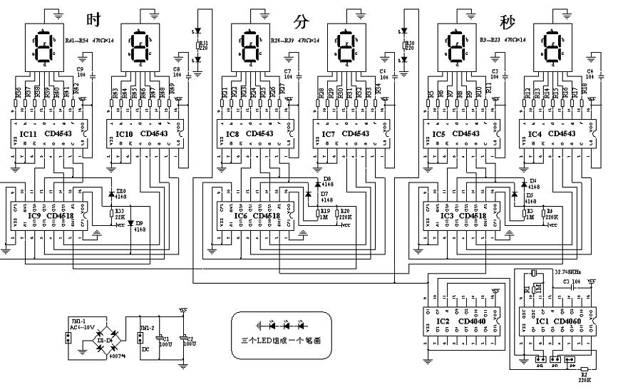 电子钟的电路原理图见后面(大图,绝对清晰) /pic/clock.gif(新款与老款的区别在于:新款采用CD4543做数码驱动要38元,老款采用CD4511做数码驱动要35元,新款图纸见本文底部。)