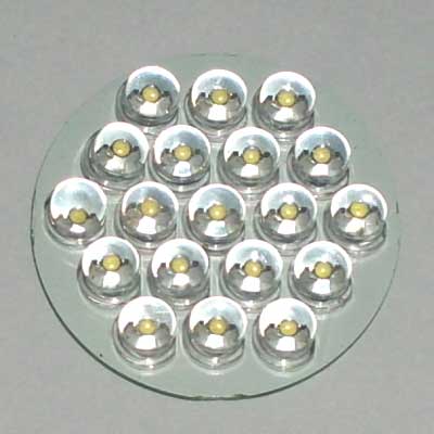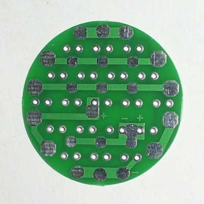 本商品是该节能灯的电路板,本板采用0.8mm高精密度的双面电路板加上高温喷锡工艺生产而成,电脑钻孔,电脑铣边。本板采用蜂窝状、六边形的足球形的阵列排布LED,布局美观,灵活多用,发光二极管安装方向全部统一相同,安装好的效果图:(请注意:本商品是出售光电路板,板上的灯请另行购买,本站有白光LED套件出售,本板单独出售是为了方便电子爱好者自行制作别的LED灯。)