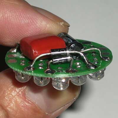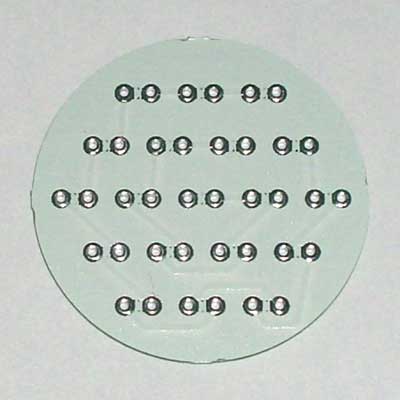 装好灯的效果,注意,极性要装对,横成行,斜成线,布局美观。安装时请注意焊接温度不要过高,焊接时间不要太长,发光二极管是很容烫坏的。焊好固定后,就不要东摇西搬发光二极管了,如果发现没有装正,应用电烙铁将引脚焊锡熔化后再校正位置,还是一句话,注意控制温度,如果装好后有LED不再发光或者发光不均匀的情况,肯定是焊接过程中导致的损坏。