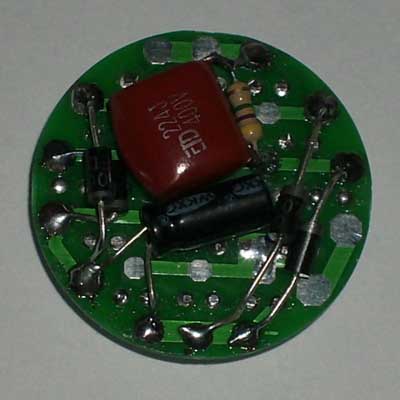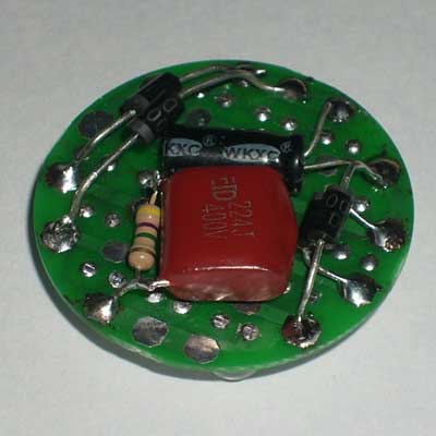 再装桥式整流器的负极臂的二极管之一靠里边,这里引脚很长都没有装套管,因为二极管互相卡住,引脚即使受到外部机械冲击也不会连在一起,再说两个二极管的负极是相同的电节点,即使短路也是允许的。