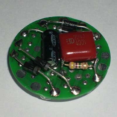 电路原理图:工作原理非常简单,通过电容限流了发光二极管的工作电流小于25MA,加上C2吸收了开关灯的冲击电流,有效的确保了发光二极管的使用寿命。采用电容降压,不消耗电能,不发热,效果好。(发光二极管的工作电流由C1的容量决定,如图最大不能超过474,如果发光二极管的工作电流超过了50MA,估计发光二极管的寿命会大大缩短!如果觉采用224亮度已经太亮,可以换容量为104的电容,这样LED的工作寿命会超过几万小时。)