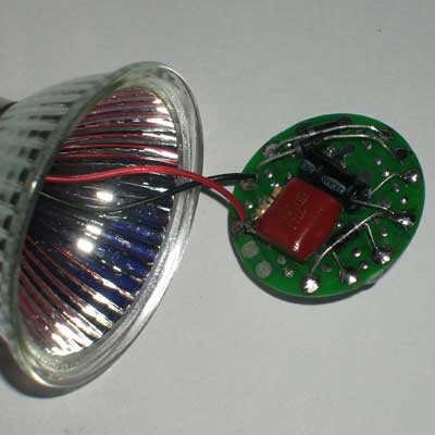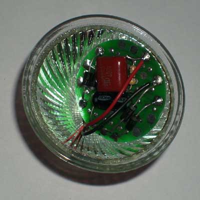 最后,将灯板放入灯杯,打上胶,封口还有一个圆平面玻璃也用胶封好,这样,外面更加无法接触到内部线路,确保安全用电!请注意:在打胶封装之前,请务必先试验OK后再封装! 备注:在灯打开或者关灯后,由于电容余电,会较慢熄灭,这是正常现象;另外由于发光二极管在关电后弱电流工作时处于非稳定状态,可能各发光二极管发光不均匀或者亮度不均匀是正常现象。
