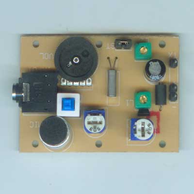 BA1404调频立体声发射板,板规格:50mm*35MM,正好用本站的制作盒当外壳。BA1404是为数不多的调频发射集成电路之一,它弥补了过去用分立元件来设计调频电路的不足,而且具有立体声调制的功能。仅用很少的外围元件就可得到优美的立体声调频信号。按照本电路装好后,频率大概在108MHz左右,只需把线圈L1的螺丝调开一点,使其振荡频率向下调低即可,就可以配合任何FM收音机接收到该高频信号,并从该高频信号还原出声音信号,从而完成各种用途。