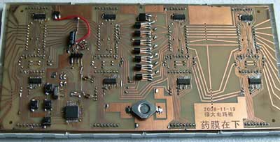图中有浑浊红色的地方是因为用了封箱胶纸捆了一根透明的IC杆,用来固定板防止板在移动时背后焊接处断开。有字错开的现象是因为照片是照的滚动显示的某一个睡间。(照相机快门时间选择的是1/30秒,不能开闪光灯,否则,闪光灯太亮会看不到LED显示。)