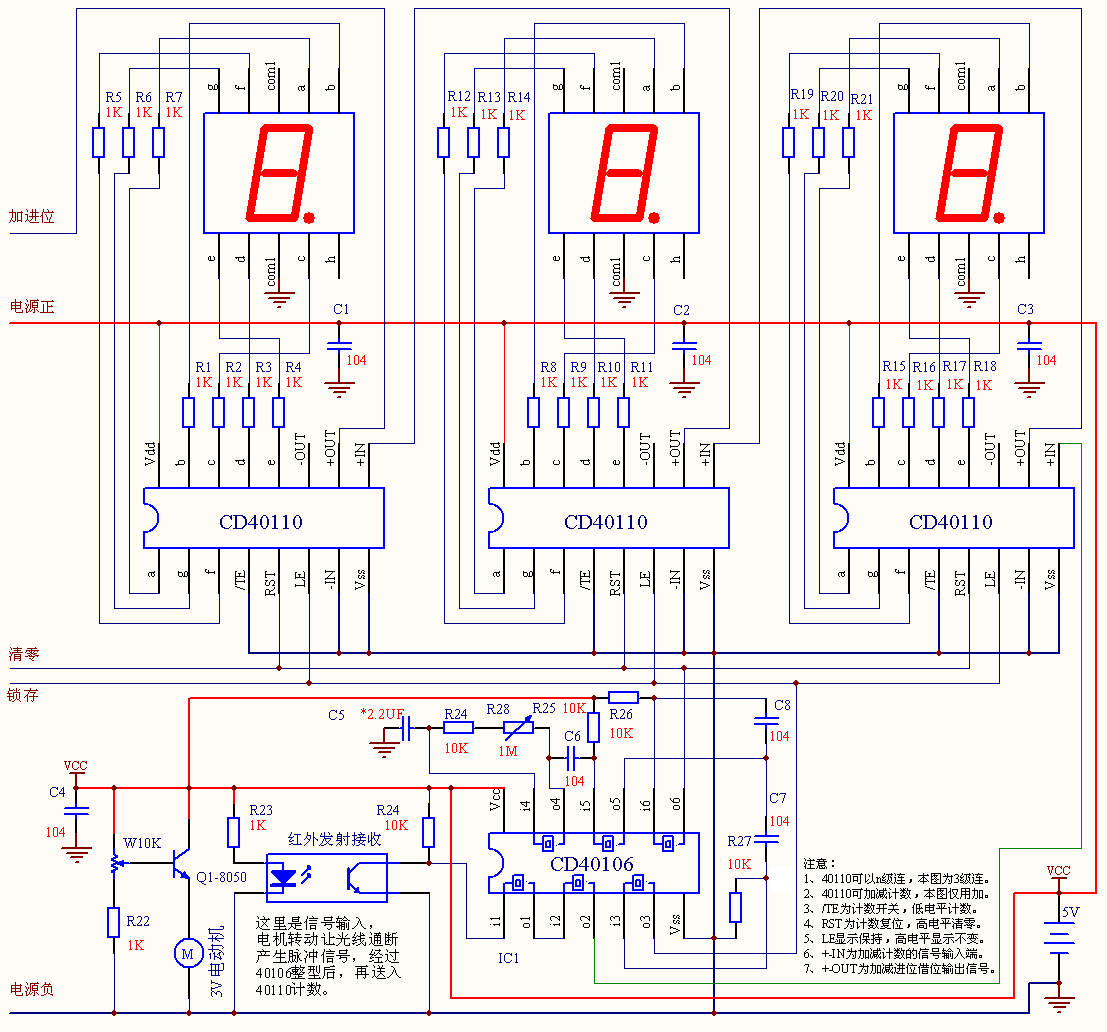 本制作采用CD40110和CD40106来实现电动机转速表功能,其中CD40110是加减计数、译码、驱动、锁存专用芯片,可以实现10进制加1、10进制减1、将计数值译成10进制的LED显示码、驱动LED,其内部的计数器和显示驱动是分开的,受计数允许(/TE)、清零复位(RST)、显示锁存控制(LE),其中计数器还具有独立的加减输入端(+-IN)和进(借)位输出端(+-OUT),本制作中,只需要用到加计数,因此减输入端(-IN)对地短路,减借位输出端(-OUT)留空。