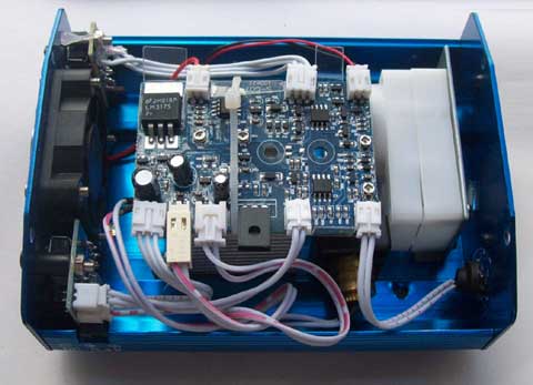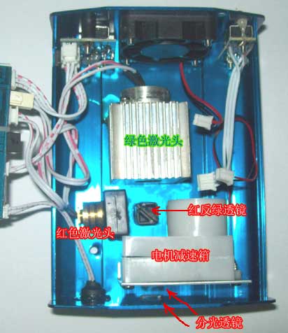 如图,大大的正位安装的铝合金散热那个是绿色激光头,侧位黑色支架铜散热的那个是红色激光头,估计整台机的成本就贵在这两只激光头上了。