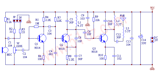 其中R1为话筒MIC的偏置电阻,一般在2K—5.6K选取。R4为集电极电阻。R5为基极电阻,给Q1提供偏置电流。R6为发射极电阻,起稳定Q1直流工作点的作用;Q2、R7、R8、C4、C5、L1、C8、C7组成高频振荡电路,R7给Q2基极提供偏流,C5和L1振荡回路,改变其值可以改变发射频率,C8为反馈电容,R8起稳定Q2直流工作点作用,C7隔直流通交流电容;Q3、R9、R10、L2、C10、C11组成高频功率放大电路。R9给功率管Q3提供基极电流,C10和L2放大调谐回路,和振荡回路C5和L1调谐在同一频点时获得最大输出功率,发射距离最远。