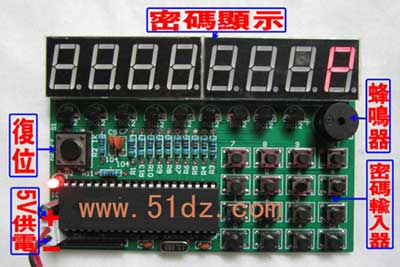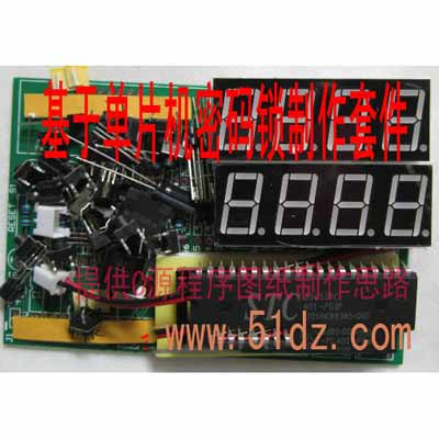 单片机电子密码锁套件:提供原理图,安装图,C的源程序,参考资料,是学习,毕业设计产品。事先在程序里设计好密码和密码位数,十个数字按键,一个“ Enter ”键,一个“ Del ”键,用数码管显示输入密码位数,输入前最后一个显 P ,用8位数码管组成显示电路提示信息,当输入密码时,只显示“8.”,当密码位数输入完毕按下确认键时, 对输入的密码与设定的密码进行比较,若密码正确,用8位数码管显示“1HELLO”或"1OPEN"作为提示信息,同时发出“叮咚”声;若密码不正确,用8位数码管显示“2ERROR”或"2Closed"作为提示信息,同时发出“嘀、嘀”报警声.在输入密码的过程中可以随时对输入的密码进行修改。原理密码我们在程序中设为"1 2 3 4 5 6 ",要改密码就得修改程序。