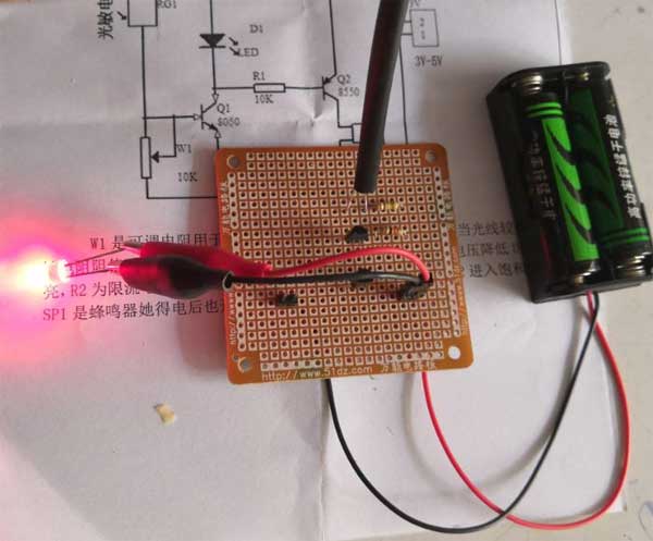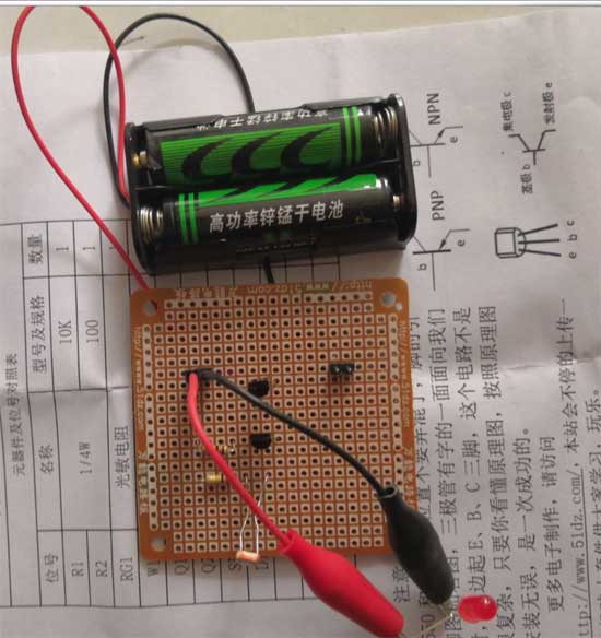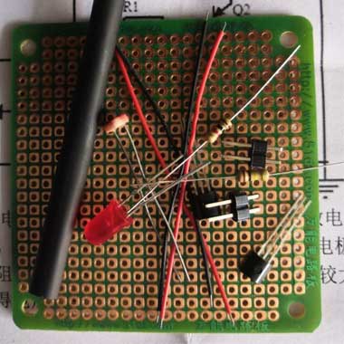 电路如图,原理较为简单,欢迎大家试作,因为元件少,本站 配的是万能板,这样方便大家跟据原理图自行搭焊,锻练动手能力和组建能力,和对原理图的理解能力,欢迎大家试做。套件没有配电池盒,需要电池盒的可以单独购买,因为电源你可以用3V-5V 都行,电源家中有就不用多次购买。需要电池盒的请在备注说明,要多少,电池盒0.8元一个。本站试验的时候是用的鱼夹线,大家在制作的时候直接将二极管焊上就行了。
