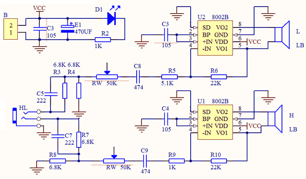 8002是一种桥工音频功率放大器,使用5V电源,且THD+N≤1.0%时,能给一个4Ω的负载提供2W的平均功能。