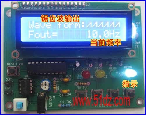 带屏函数信号发生器套件:本套件是利用STC89C52单片机和数模转换器件DAC0832产生所需不同信号的低频信号源,即采用STC89C52 单片机作为控制核心,而在外围采用数字/模拟转换电路(DAC0832)、运放电路(LM358)、按键和LCD液晶显示电路等,通过按键可控制产生方波、锯齿波、三角波、正弦波,同时用LCD液晶显示对应的波形输出。设计过程中主要实现利用按键来控制不同波形的输出,当按键1按下时,函数发生器就切换不同的波形;当按键2按下时,函数发生器就加频率;当按键3按下时,函数发生器就减频率;当按键4按下时,函数发生器就进入调节步进值。