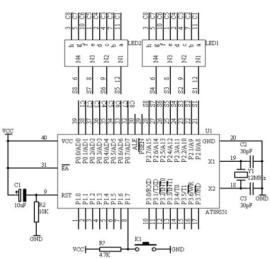 动态接口采用各数码管循环轮流显示的方法,当循环显示频率较高时,利用人眼的暂留特性,看不出闪烁显示现象,这种显示需要一个接口完成字形码的输出(字形选择),另一接口完成各数码管的轮流点亮(数位选择)。