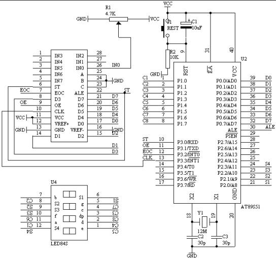 利用单片机AT89S51与ADC0809设计一个数字电压表,能够测量0-5V之间的直流电压值,四位数码显示,但要求使用的元器件数目最少。