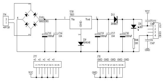 电源模块为系统板上其它模块提供+5V电源,电源输入有两种方式,一种为交直流电源从电源插座输入,输入的电压要求,直流输入应大于7.5V,交流输入应大于5V,通过7805三端稳压器得到5V的直流电源供给系统其它模块工作,另一种为从USB接口获取+5V电源,只要用相应配套的USB线从电脑主机获取+5V直流电源,在电源模块中加有保护电路,即电路中有短路,不会对7805三端稳压器及电脑主机电源有损害!其电路原理图如图1.4所示: