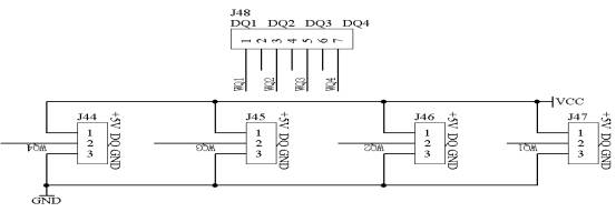 为了适应新技术的需要,增加1-Wire总线接口,在本系统板上提供了四路1-Wire总线接口,数据传输通过“DQ1 DQ2 DQ3 DQ4”端口来完成;具体的电路原理图如图1.20所示: