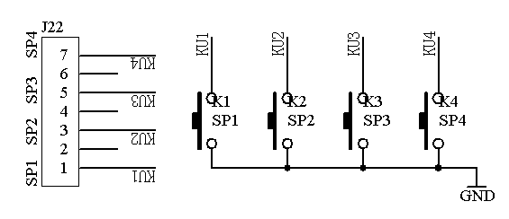 键盘是人机通信不可缺少的部件,独立式键盘是最基本的一种键盘方式,在本系统中提供了四个独立式按键;具体的电路原理图如图1.22所示: